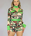Dieses robuste und doch sexy Militärkostüm ist superbequem. Es ist ein taillierter Playsuit mit Camouflage-Aufdruck und hat lange Ärmel. Der Kragen hat einen V-Ausschnitt und einen Reißverschluss an der Vorderseite. Auf dem Kragen befinden sich zwei Embleme. Außerdem hat er zwei dekorative Brusttaschen.