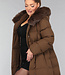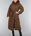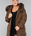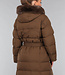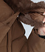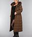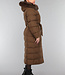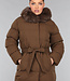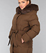 Dieser wasserabweisende Wintermantel ist lang geschnitten und gesteppt, was ihn wunderbar warm macht. Die Vorderseite hat einen Knopfverschluss mit fünf Druckknöpfen. Die Jacke hat außerdem eine Kapuze mit Fellkragen und einen Taillenbund. Der Fellkragen der Kapuze kann mit kleinen Knöpfen abgenommen werden. An der Vorderseite befinden sich zwei Reißverschlusstaschen und zwei Gürtelschlaufen, durch die man den mitgelieferten Hosenbund stecken kann.