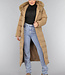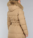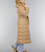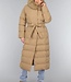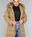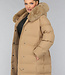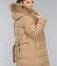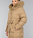 Dieser wasserabweisende Wintermantel ist lang geschnitten und gesteppt, was ihn wunderbar warm macht. Die Vorderseite hat einen Knopfverschluss mit fünf Druckknöpfen. Die Jacke hat außerdem eine Kapuze mit Fellkragen und einen Taillenbund. Der Fellkragen der Kapuze kann mit kleinen Knöpfen abgenommen werden. An der Vorderseite befinden sich zwei Reißverschlusstaschen und zwei Gürtelschlaufen, durch die man den mitgelieferten Hosenbund stecken kann.