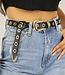 Dieser Gürtel ist schwarz und besteht aus einem Material in Lederoptik. Er ist 2,5 cm breit und hat einen dekorativen goldenen Schnallenverschluss. Sie können ihn an vielen verschiedenen Größen tragen.