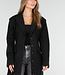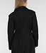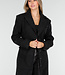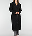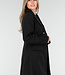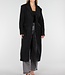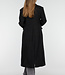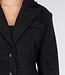 Dieser lange Mantel ist in einem leicht melierten Schwarz gehalten. Der Mantel hat eine gerade und leicht taillierte Silhouette und ist lang geschnitten. Die Vorderseite wird mit einer Reihe schwarzer Knöpfe geschlossen und verfügt über zwei Pattentaschen in Hüfthöhe und eine Brusttasche. Der Mantel hat einen klassischen Reverskragen und dekorative Knopfdetails an den Ärmelenden. Das Material hat eine leicht wollige Optik und eine feste Struktur.