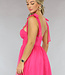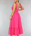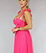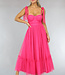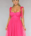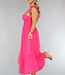 Dieses süße Kleid hat einen rosa Tupfenprint. Es hat Spaghetti-Träger, die man an der Schulter binden kann. Das Kleid hat einen herzförmigen Ausschnitt und einen verdeckten Reißverschluss auf der Rückseite. Der Rock fällt ab der Taille schön weit/gefaltet. Das Kleid fällt bis zur Mitte des Unterschenkels.