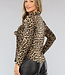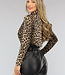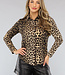 Diese Bluse mit Panther-Print ist aus einem weichen Stoff mit hohem Stretchanteil gefertigt. Sie hat lange Ärmel und einen Kragen. Auf der Vorderseite befindet sich ein Knopfverschluss, der aus sechs goldenen Knöpfen besteht.