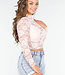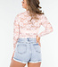 Dieses modische, blassrosa Crop-Top ist aus luxuriöser Spitze gefertigt und mit einem wunderschönen Rosenprint versehen. Die langen Ärmel und der hohe Ausschnitt verleihen ihm einen trendigen Look, während der durchsichtige Stoff perfekt für einen gewagten Look oder unter einem Oversize-T-Shirt ist.