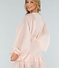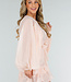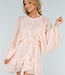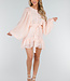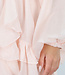 Dieses hellrosa Kleid ist aus einem luftigen Stoff mit feiner Webstruktur gefertigt. Es hat einen kurzen Stehkragen, einen Rundhalsausschnitt ohne Kragen und Revers, einen kurzen, gepolsterten Knopfverschluss vorne und auffällige Volants über der Brust und am Saum. Die Taille ist mit einem gerüschten Band versehen. Die langen, halbtransparenten Ballonärmel in Leinenoptik enden in elastischen Manschetten, die einen Puff-Effekt erzeugen. Der Rock ist mit asymmetrisch platzierten Volants überlagert und fällt weit über das Knie. Der Rücken fällt nach oben hin ab, so dass die Taille fällt.