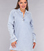 Dieses Kleid ist aus einem dicken Baumwoll-Denimstoff mit leichter Waschung gefertigt und mit Stretch versehen. Das Kleid hat lange Ärmel und einen oversized und baggy Schnitt. Das Kleid hat einen umgeschlagenen Kragen mit V-Ausschnitt. Die Ärmel des Kleides sind gerade geschnitten.