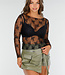 Dieses schwarze Oberteil ist aus transparentem Mesh mit einer Spitzenstruktur und einem ruhigen Blumendruck über das gesamte Oberteil gefertigt. Der Stoff ist dehnbar und liegt eng am Körper an. Es hat lange Ärmel und einen Bootsausschnitt. Die Kombination aus transparentem Stoff und dezentem Druck macht dieses Oberteil perfekt für jede Gelegenheit.