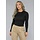 Dieses Oberteil ist aus einem feinen Stretch-Stoff gefertigt. Das Oberteil hat lange Ärmel und einen hohen Kragen. Das Oberteil hat eine Überlappung auf der Vorderseite, die mehrere Falten aufweist. Das Oberteil ist einfarbig.