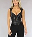 Dieses Oberteil in Lederoptik hat einen Westenstil. Das Top ist ärmellos und hat einen herzförmigen Ausschnitt. Das Oberteil ist nicht gepolstert, aber da das Oberteil aus einem robusten Stoff in Lederoptik gefertigt ist, ist das Tragen eines BHs nicht notwendig. An der Vorderseite befindet sich ein großer Hakenverschluss mit 10 Haken, die Sie in eine Position bringen können.