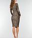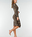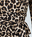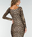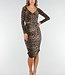 Dieses Leoparden-Kleid hat lange Ärmel und einen U-Ausschnitt. Der Stoff ist dehnbar, vorne in Falten gelegt und mit einem Schleifengürtel in der Taille versehen. Die Passform ist eng und geht bis über das Knie.