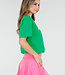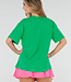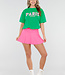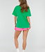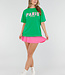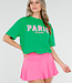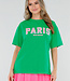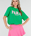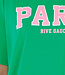 Dieses T-Shirt ist aus grünem Stoff gefertigt und hat eine gerade, locker sitzende Passform. Das Modell hat kurze Ärmel und einen Rundhalsausschnitt mit festem Kragen. Auf der Vorderseite befindet sich ein kontrastierender rosa Aufdruck mit dem Schriftzug „PARIS” und darunter „RIVE GAUCHE”. Der Stoff hat eine geschmeidige Stretchstruktur und eine glatte Oberfläche.