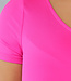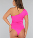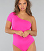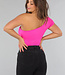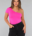 Dieser Body ist aus einem feinen Stretch-Stoff gefertigt. Der Bodysuit hat ein Ein-Schulter-Design mit kurzen Ärmeln. Der Body ist tailliert und hat unten einen Hakenverschluss, der aus zwei Haken besteht, die in drei Positionen eingestellt werden können.