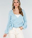 Dieser Pullover ist aus einem hellblauen, fein gestrickten Rippstoff gefertigt. Das Modell hat einen Überwurf auf der Vorderseite, der mit einem Kordelverschluss an der Seite befestigt wird. Der Pullover hat einen V-Ausschnitt und lange Ärmel mit einer leicht voluminösen Form. Die Bündchen und der Saum sind mit einem Rippstrickabschluss versehen und die Passform schmiegt sich an den Körper an.