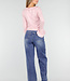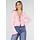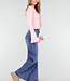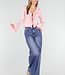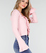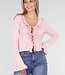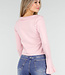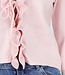 Dieses hellrosa Oberteil hat eine figurbetonte Passform und ist aus einem fein gestrickten, weichen Stretchstoff gefertigt. Die Vorderseite ist mit schmalen Strickbändern und Rüschen verziert, die sich entlang des Ausschnitts und des Saums fortsetzen. Die Ärmel haben einen leicht ausgestellten Saum mit dezenter Rüschenborte.