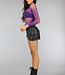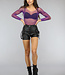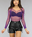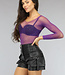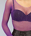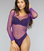 Dieser Body hat ein Netzmuster und ein schulterfreies Design. Der Body ist mit einem Netzmuster und Glitzersteinen versehen. Der Body ist tailliert und lila. Außerdem verfügt der Body über lange Ärmel und ein Tanga-Modell. Der Body hat unten keinen Verschluss, lässt sich aber dank des Stretchanteils leicht an- und ausziehen.