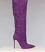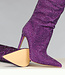 Diese tollen Glitzerstiefel haben eine stilvolle spitze Spitze und einen hohen Stilettoabsatz. Man muss von oben in die Stiefel einsteigen, es gibt keinen Reißverschluss in den Stiefeln. Die Stiefel sind mit Glitzersteinen besetzt, die den gesamten Schuh bedecken. Die Stiefel fallen unterhalb des Knies.