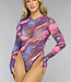 Dieser bedruckte Body ist aus einem bequemen und luftigen Netzmaterial gefertigt. Der Body hat lange Ärmel mit Daumenlöchern, einen Rundhalsausschnitt und am unteren Ende zwei Druckknöpfe. Das Unterteil des Bodys fällt wie ein Tanga-Modell.