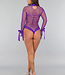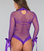 Dieser Body ist aus einem dehnbaren Netzstoff gefertigt. Der Body ist trägerlos geschnitten und fällt unten wie ein Brasilianer und ist mit einem Spitzenbesatz versehen. Der Body hat keinen Verschluss, lässt sich aber dank des Stretchanteils leicht an- und ausziehen. Der Bolero ist aus demselben Stoff gefertigt und hat lange Ärmel mit einer festen Stulpe. Um das Handgelenk herum befindet sich ein süßes Schleifendetail. Der Bolero hat einen hohen Halsausschnitt mit Spitzenbesatz und einen Druckknopfverschluss auf der Rückseite.