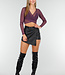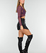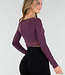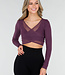 Dieses Oberteil ist in Lila gehalten und aus transparentem Mesh gefertigt. Das Modell hat eine überlappende Vorderseite, die einen V-Ausschnitt bildet. Der mittlere Teil ist durch den Wickel-Look teilweise offen gearbeitet. Die langen Ärmel sind vollständig aus Mesh und liegen eng an. Die Rückseite ist glatt und aus dem gleichen Mesh-Stoff gefertigt.