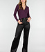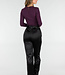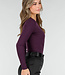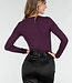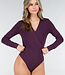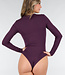 Dieser lilafarbene Body ist aus einem glatten, dehnbaren Stoff gefertigt und hat eine eng anliegende Passform. Das Modell hat lange Ärmel, einen Überwurf vorne und einen hohen Beinausschnitt. Der Body wird mit einem Hakenverschluss geschlossen, der in drei Positionen eingestellt werden kann.