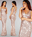 Dieses wunderschöne lange Kleid ist perfekt für eine Gala. Die rosa Pailletten lassen es auf der Tanzfläche oder in der Sonne glitzern. Das Kleid ist nackt und die Pailletten verlaufen in einem dekorativen Muster über das ganze Kleid. Es hat breite Schulterriemen und einen V-Ausschnitt. Der Rücken fällt ebenfalls in ein ''V'' und wird mit einem verdeckten Reißverschluss geschlossen. Hinten ist es etwas länger, so dass es ein wenig zieht, wenn man keine zu hohen Absätze trägt. Das Kleid hat einen Gummizug, so dass es oben gut sitzt und ab dem Gesäß weit ausläuft.