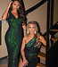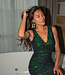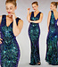 Dieses wunderschöne lange Kleid ist perfekt für eine Gala. Die blau/grünen Pailletten lassen es funkeln und wechseln ständig die Farbe! Es ist schwarz und die Pailletten verlaufen in einem dekorativen Muster über das ganze Kleid. Es hat breite Schulterriemen und einen V-Ausschnitt. Der Rücken fällt ebenfalls in ein ''V'' und es gibt einen verdeckten Reißverschluss. Hinten ist es etwas länger, so dass es ein wenig zieht, wenn man keine zu hohen Absätze trägt. Das Kleid hat einen Gummizug, so dass es oben gut sitzt und ab dem Gesäß weit ausläuft.