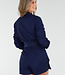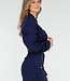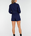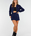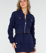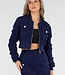 Dieses Set besteht aus einer navyblauen Bomberjacke mit verkürzter Passform und einem passenden Skort mit Cargotaschen. Die Jacke hat einen runden Kragen, lange Ärmel mit Plissee-Detail und einen silbernen Reißverschluss an der Vorderseite. Der Skort hat einen taillierten Schnitt mit kurzen Ärmeln und einer Klappe auf der Vorderseite. Beide Teile sind aus einem glatten, robusten Stoff mit Stretch.