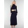 Dieses marineblaue zweiteilige Set besteht aus einem kurzen Oberteil und einem langen Rock. Das Oberteil hat einen Rollkragen, lange Ärmel und einen Cut-out an einer Schulter. Es ist figurbetont geschnitten und endet oberhalb der Taille. Der Rock ist lang und leicht ausgestellt. Beide Teile sind aus glattem, leicht dehnbarem Jersey in einfarbigem Dunkelblau gefertigt.