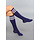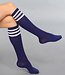 Diese Socken reichen bis unter das Knie und sind aus einem dehnbaren Stoff gefertigt. Sie sind marineblau und haben drei weiße Streifen am oberen Ende.