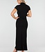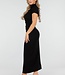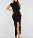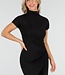 Schwarzes Maxikleid aus dehnbarem Jersey mit glatter Oberfläche. Mit Rollkragen, kurzen Ärmeln und taillierter Passform. Der Rock ist lang und hat vorne einen hohen Schlitz. Der Stoff ist dehnbar, sodass das Kleid schön sitzt und bequem zu tragen ist.