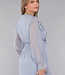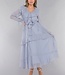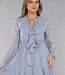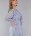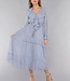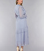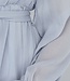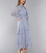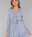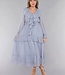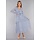 Dieses lange Kleid ist aus einem luftigen Chiffonstoff gefertigt. Das Oberteil des Kleides hat einen V-Ausschnitt, der mit niedlichen Rüschen und einem Schleifendetail versehen ist. Das Kleid hat einen ausgestellten Rock mit einem Lagenmuster. Das Kleid hat Trompetenärmel und ist durchsichtig. Es ist mit einem Innenkleid ausgestattet, damit es nicht durchscheint. Das Innenkleid und das Chiffonkleid haben keinen Stretchanteil, fallen aber fließend. Um die Taille herum ist es dehnbar und hat einen passenden Bund.