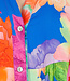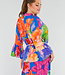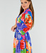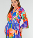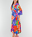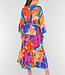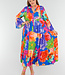 Dieses Maxikleid hat einen farbenfrohen Blumendruck in Rot, Blau, Lila, Orange, Grün und Rosa. Das Kleid hat einen durchgehenden Knopfverschluss auf der Vorderseite und einen Stehkragen. Die Ärmel sind dreiviertellang und haben eine leichte Trompetenform. Der Rock fällt weit und mehrlagig bis zu den Knöcheln, und der Stoff hat ein glattes, leicht glänzendes Finish.