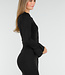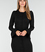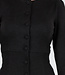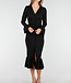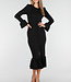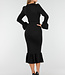 Dieses dunkelblaue Kleid ist aus einem festen, dehnbaren Stoff gefertigt und hat eine figurbetonte Passform. Das Kleid reicht bis zu den Knöcheln und hat eine durchgehende Knopfleiste auf der Vorderseite. Der runde Ausschnitt geht in lange Ärmel über, die in weit ausgestellten Manschetten mit Rüschen enden. Auch der Saum des Kleides ist mit einem breiten Rüschenbesatz versehen, der für zusätzliches Volumen sorgt.
