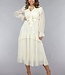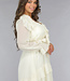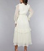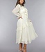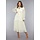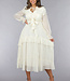 Dieses lange Kleid ist aus einem luftigen Chiffonstoff gefertigt. Das Oberteil des Kleides hat einen V-Ausschnitt, der mit niedlichen Rüschen und einem Schleifendetail versehen ist. Das Kleid hat einen ausgestellten Rock mit einem Lagenmuster. Das Kleid hat Trompetenärmel und ist durchsichtig. Es ist mit einem Innenkleid ausgestattet, damit es nicht durchscheint. Das Innenkleid und das Chiffonkleid haben keinen Stretchanteil, fallen aber fließend. Um die Taille herum ist es dehnbar und hat einen passenden Bund.