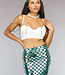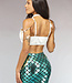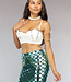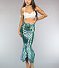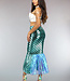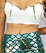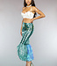 Das Oberteil hat vorgeformte Cups und ist mit verstellbaren Spaghettiträgern und goldenen Pailletten verziert. Der Rock ist grün mit einem Schuppenaufdruck und hat am unteren Ende einen Netzeinsatz. Das Kostüm wird mit einer Perlenkette und Kopfschmuck geliefert.