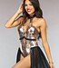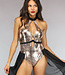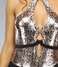 - Einem Metallic-Bodysuit mit Schlangendruck