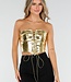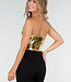 Dieses goldene Korsett-Top ist aus einem metallisch glänzenden Material gefertigt. Das Oberteil ist nicht dehnbar und wird mit der Schnürung auf der Vorderseite geschlossen. Außerdem hat das Oberteil geformte Bügel-Cups, die für eine tolle Passform und Unterstützung sorgen.