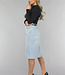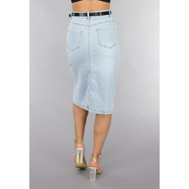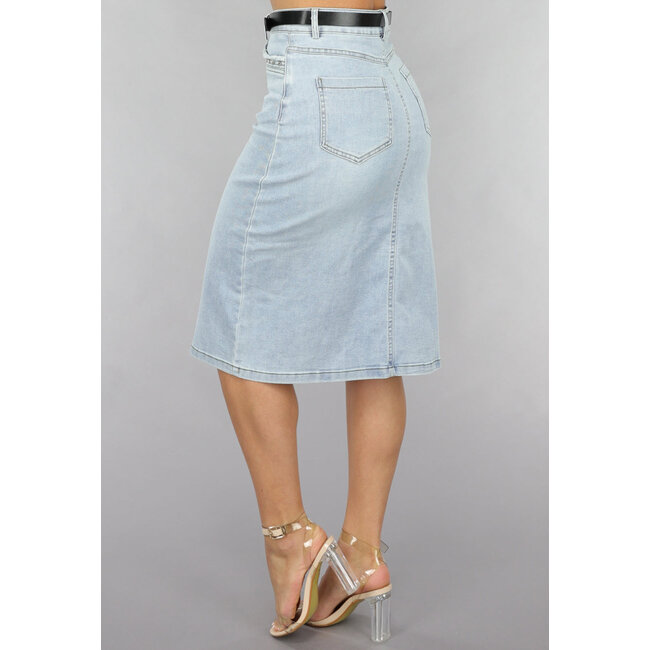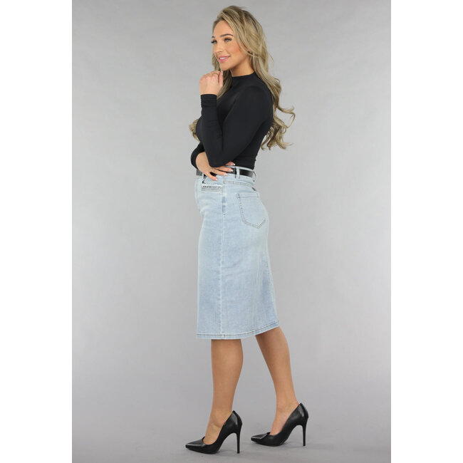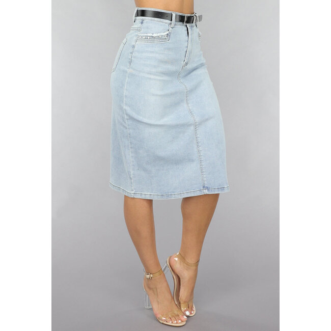 Dieser Midirock aus Stretch-Denim hat eine bequeme Passform und eine leichte Waschung. Das Modell mit hoher Taille wird mit einem Knopf und einem einzelnen Reißverschluss geschlossen. Auf der Vorderseite hat der Rock zwei Ziertaschen, während die Rückseite minimalistisch gestaltet ist. Die subtilen Details um die Taschen herum verleihen ihm einen stilvollen Touch. Dank der fünf Gürtelschlaufen können Sie den Rock mit dem mitgelieferten Gürtel oder einem Gürtel Ihrer Wahl tragen. Dank des Stretch-Stoffes lässt sich der Rock leicht bewegen und ist den ganzen Tag über bequem!