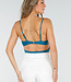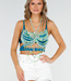 Diese Körperkette besteht aus mehreren Schichten von Perlen in Mintgrün, Türkis, Lindgrün und transparentem Glas. Die Perlen sind auf Reihen aufgereiht, die spielerisch über die Brust und den Bauch fallen und mit feinen Goldketten verbunden sind. Auf dem Rücken verläuft die Kette entlang der Schultern und über die Mitte des Rückens. Der Verschluss befindet sich im Nackenbereich und ermöglicht eine verstellbare Passform. Das Accessoire ist so konzipiert, dass es über einem Oberteil oder einem Body getragen werden kann.