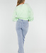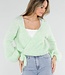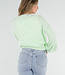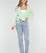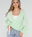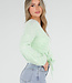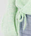 Diese Strickjacke ist aus mintgrünem, fein gestricktem Rippstoff gefertigt und besteht aus einer bequemen Wollmischung. Das Modell hat einen Überwurf auf der Vorderseite, der mit einem Kordelverschluss an der Seite befestigt wird. Der Pullover hat einen V-Ausschnitt und lange Ärmel mit einer leicht voluminösen Form. Die Ärmelbündchen und der Saum sind mit einem Rippstrickabschluss versehen und die Passform schmiegt sich an den Körper an.