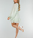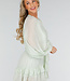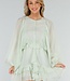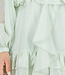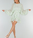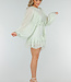 Dieser hellgrüne Playsuit ist aus einem luftigen Stoff mit einer feinen Webstruktur gefertigt. Er hat einen Rundhalsausschnitt ohne Kragen und Revers, einen kurzen, gepolsterten Knopfverschluss auf der Vorderseite und auffällige Volants auf der Brust und am Saum. Die Taille ist mit einem gerüschten Band versehen. Die langen, halbtransparenten Ballonärmel in Leinenoptik enden in elastischen Manschetten, die einen Puff-Effekt erzeugen. Der Überrock ist mit asymmetrisch platzierten Volants überlagert und fällt weit über das Knie. Der Rücken fällt nach oben hin ab, so dass die Taille fällt.