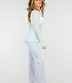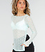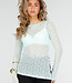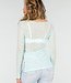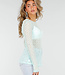 Dieses Oberteil ist in Mintgrün gehalten und vollständig aus Spitze mit offener Struktur gefertigt. Das Modell hat lange Ärmel und einen Rundhalsausschnitt. An der Unterseite ist das Oberteil mit einem Seitenschlitz versehen. Die Passform ist gerade und das Spitzenmuster ist gleichmäßig über die gesamte Oberfläche verteilt.