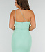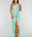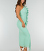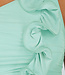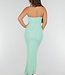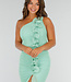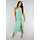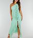 Dieses mintgrüne Maxikleid ist aus einem glatten, dehnbaren Stoff gefertigt und hat eine eng anliegende Passform. Das Kleid hat ein asymmetrisches Design mit einem Schulterriemen, der diagonal über den Rücken verläuft. Auf der Vorderseite verläuft eine vertikale Reihe von Rosetten, die in eine leichte Faltenstruktur und ein Netzgewebe eingearbeitet sind. Der Rock hat einen tiefen vorderen Schlitz und reicht bis zur Mitte der Wade. Der Rücken ist hoch tailliert und wird mit einem verdeckten Reißverschluss geschlossen. Der Stoff ist völlig dehnbar und passt sich dem Körper an.