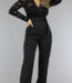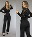 Dieser schwarze Jumpsuit hat einen leichten Stretchanteil. Das Oberteil ist aus Spitze gefertigt, wodurch es leicht durchsichtig ist. Auf der Rückseite befindet sich ein verdeckter Reißverschluss. Der Jumpsuit hat außerdem einen verstellbaren Taillengürtel.
