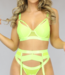 Alle Teile sind aus neongelbem Mesh und elastischen Trägern gefertigt. Der BH ist mit Bügeln und verstellbaren/nicht abnehmbaren Trägern ausgestattet. Auf dem Rücken befindet sich ein Hakenverschluss, der aus zwei Haken besteht, die in zwei Positionen eingestellt werden können. Schmale, verstellbare Träger über der Brust verbinden sich mit den Schulterträgern. Der Strapsgürtel ist breit und hat einen verstellbaren Hakenverschluss auf der Rückseite. Rundherum gibt es vier feste/verstellbare Strumpfhalter. Zu diesem Set gehören ein passender Stringtanga und zwei Netzstrumpfbänder, an denen vier silberfarbene Ringe befestigt sind. An diesen Ringen werden die Strumpfhalter befestigt.