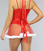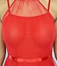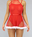 Dieser Body ist aus Mesh gefertigt und schimmert daher durch. Der Body hat verstellbare/nicht abnehmbare Schulterträger. Der untere Teil des Bodys fällt wie ein Tanga. Darüber trägt man das Wickelkleid. Dieses Kleid ist aus Mesh und hat eine rote Farbe. Das Kleid sollte am Halsausschnitt und in der Taille gebunden werden.