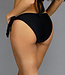 Dieser trendige Bikini ist einfarbig schwarz. Das Oberteil ist vorgeformt und hat einen kleinen Push-Up. Es hat einen Träger, der im Nacken zu binden ist, und einen Hakenverschluss am Rücken. Von der Brust aus verlaufen zwei Bänder unter der Brust zum Rücken, wo man sie zusammenbinden muss. Dies ist eine Art Überlappung. Die Shorts haben einen normalen Schnitt und eine Schleife an beiden Seiten. So kann man die Hose leicht verstellen.