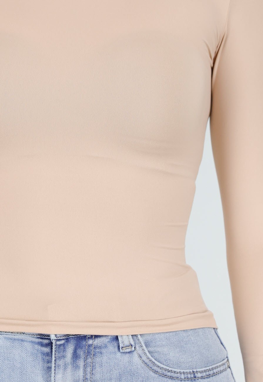 Deze top is uitgevoerd in een gladde, elastische stof in een beige kleur. Het model heeft een aansluitende pasvorm en een ronde halslijn. De mouwen zijn lang en sluiten strak aan langs de armen.