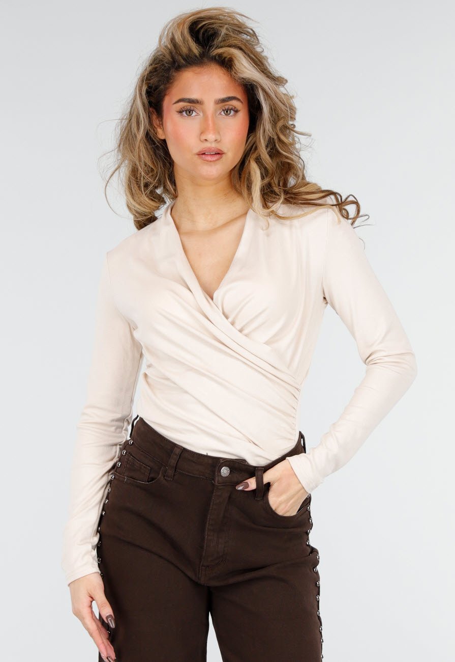 Beige Overslag Top met Lange Mouwen