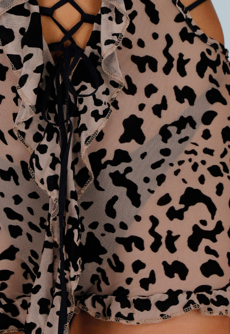 Beige Stretch Luipaard Mesh Playsuit met Ruffles